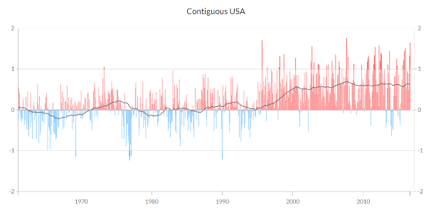 The ACI is one tool that has recently become available to actuaries. It uses a reference period of 1961 to 1990 for United States and Canadian climate data, which serves as a benchmark to evaluate how much the climate has shifted. Six carefully selected climate variables are averaged together to create the ACI: high-temperature events, low-temperature events, heavy rainfall, drought, high wind, and sea level. The ACI can also be broken down by component or region to provide more specific information based on user preferences. The graph below shows the total ACI for the contiguous United States using monthly data from the beginning of 1961 to the summer of 2016. An overall increasing trend can be seen since the reference period, with a higher index representing an increased occurrence of extreme weather.