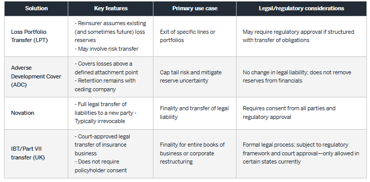 Note: The descriptions of exit and legacy liability solutions summarized in this table draw primarily from the National Association of Insurance Commissioners Restructuring Mechanisms (E) Working Group white paper on insurance restructuring mechanisms, which provides an overarching regulatory framework for mechanisms such as loss portfolio transfers, adverse development covers, assumption reinsurance/novation, and statutory business transfers (including IBT- and Part VII–type structures). Supplemental industry sources were reviewed to provide additional context on market practice and transaction features.